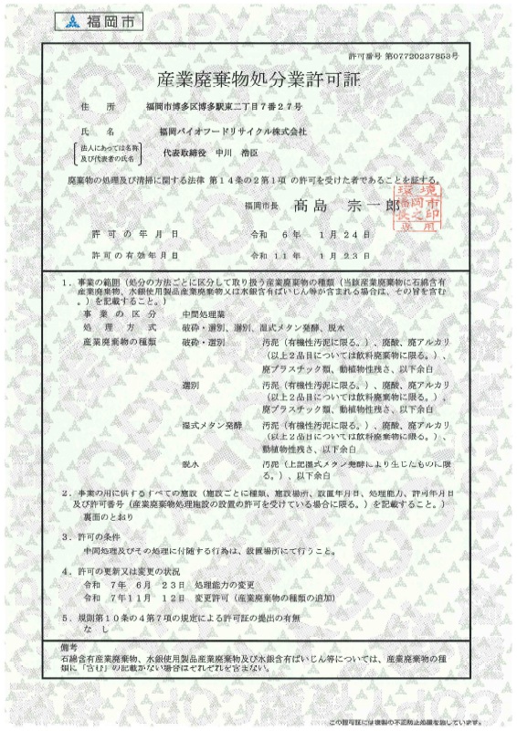 産業廃棄物処分業許可証の変更を行いました。